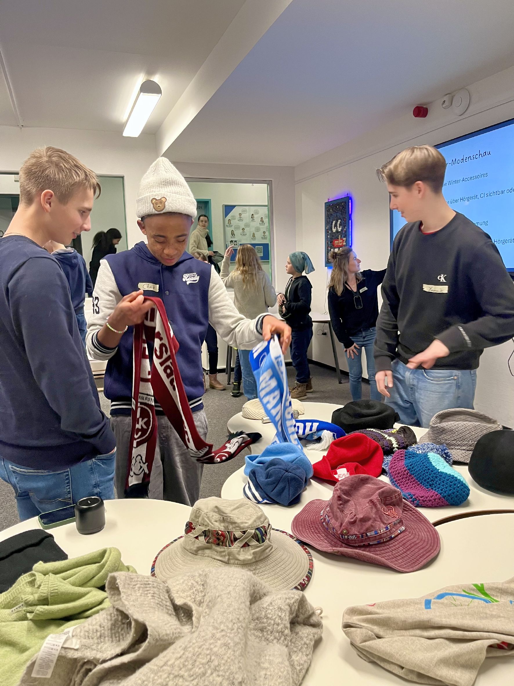 Nach einigen Aufwärmspielen machten wir uns an den ersten Programmpunkt unseres Treffens. Bei unserer Modenschau war das Motto: „Mütze und Hörgeräte/CI… kann das gut gehen? – Funktionalität trifft Fashion!“. Viele Lamas hatten ihre persönliche Lieblingskopfbedeckung mitgebracht und in kleinen Gruppen präsentierten wir unsere Mode-Tipps gemeinsam mit dem ein oder anderen Hinweis auf die Hörtechnik.