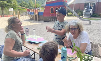Bevor es ans Schlafen ging, wollten wir aber noch das schöne Wetter genießen. Wir suchten uns eine schattige Ecke am Piratenschiff auf dem Spielplatz und bastelten dort kleine Duftkissen.